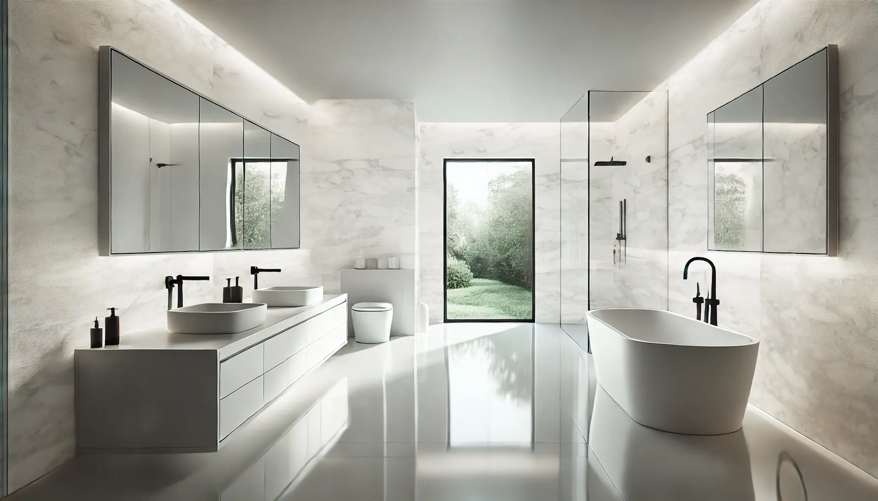 Los sutiles contrastes de Calacatta Blue permiten combinarlo con otros materiales para crear ambientes equilibrados, desde cocinas modernas hasta baños de lujo.