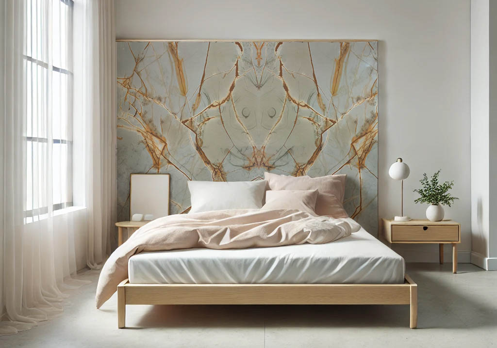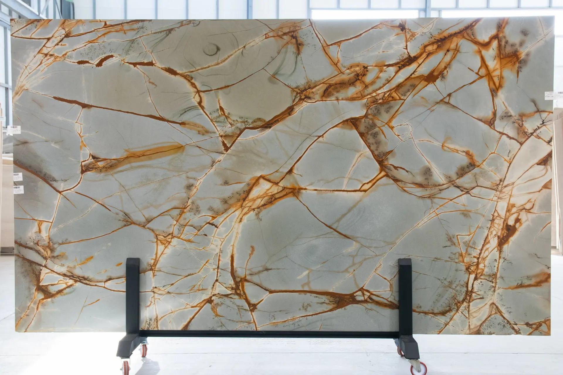 En ciertas losas, el azul se intensifica en zonas concretas, generando remolinos cromáticos que aportan dramatismo y profundidad. Las vetas cobrizas, a veces más finas y otras más anchas, parecen caminos de metal fundido que atraviesan la piedra con energía orgánica. Esta riqueza de matices confiere a cada fragmento una identidad visual irrepetible. Blue Roma es un mármol que invita a detenerse y explorar sus detalles, ofreciendo un espectáculo cromático que combina elegancia, fuerza y sofisticación. Este diálogo cromático entre el azul y el cobre crea una tensión visual muy atractiva, que se enriquece con pequeños matices grises y cremosos en algunas áreas. Cada losa de Blue Roma parece una pintura abstracta, con composiciones únicas que varían en densidad y dirección del veteado. Es una piedra que combina el dramatismo de los contrastes con una elegancia innata, logrando un equilibrio entre fuerza y sofisticación.