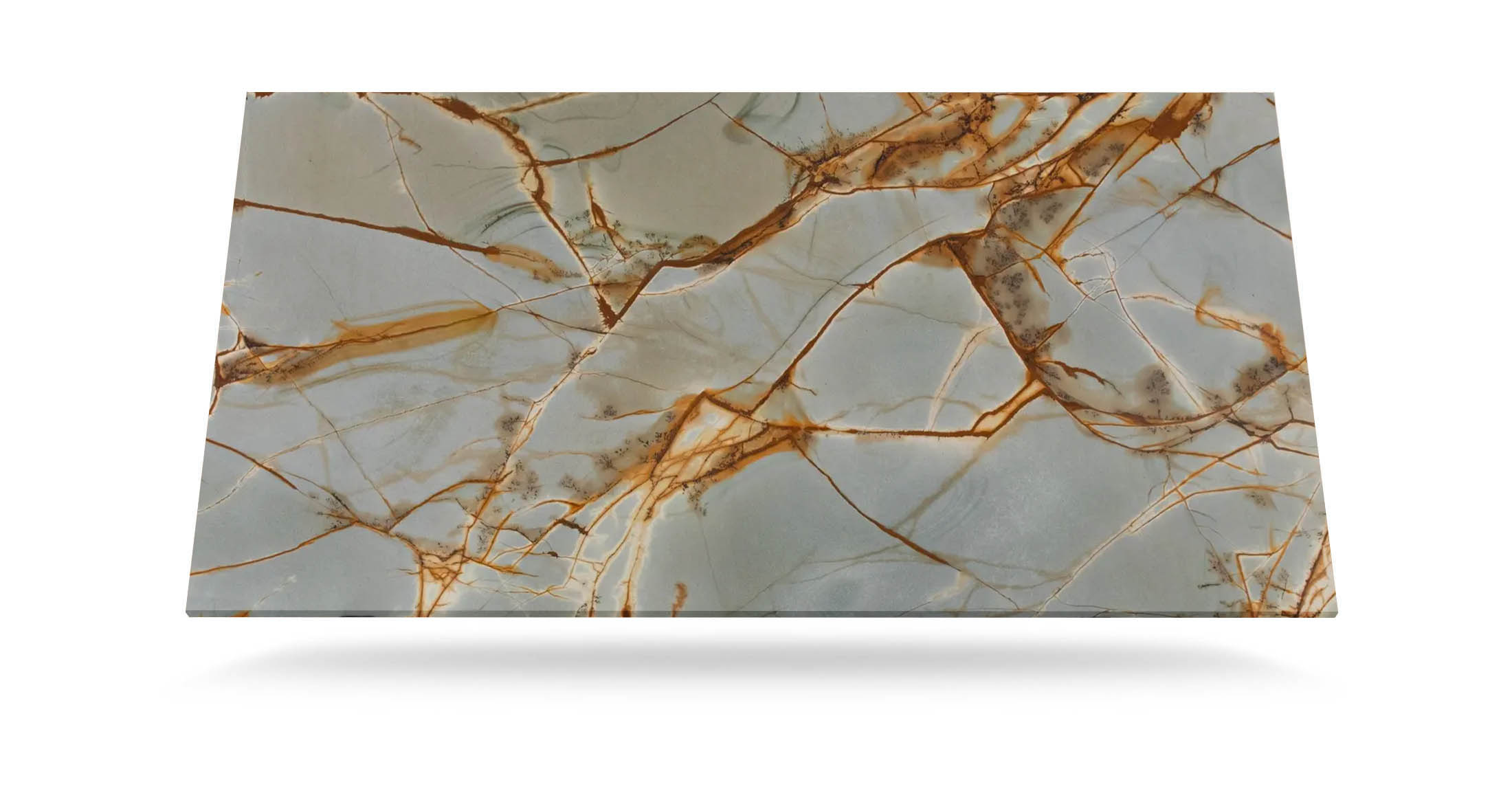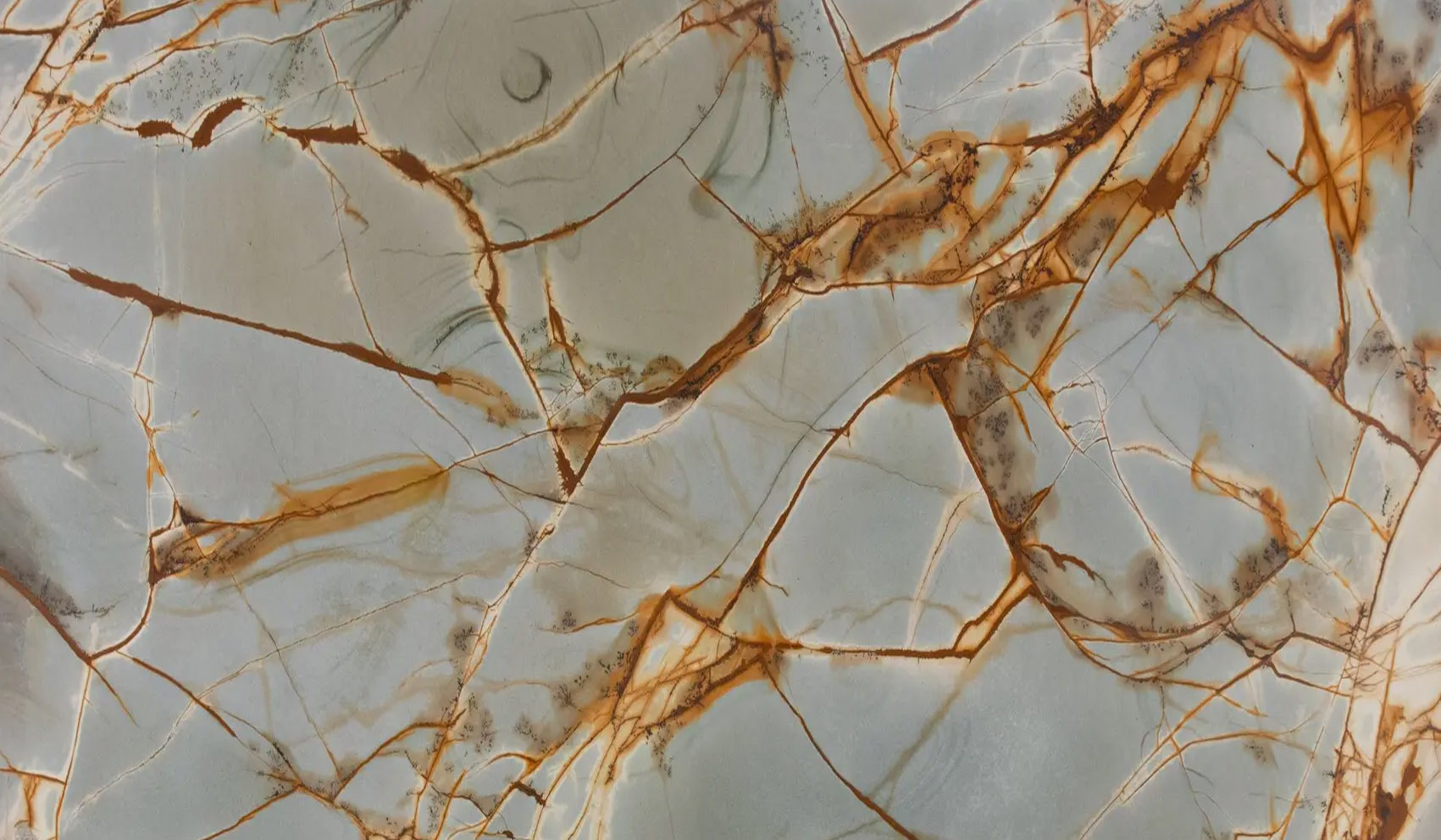 Blue Roma Blue Roma es un mármol cautivador por la singularidad de su paleta. El fondo, en un azul grisáceo de matiz ahumado, tiene una cualidad casi translúcida que aporta profundidad y misterio. Sobre él, vetas cobrizas y doradas se ramifican con intensidad, generando contrastes cálidos sobre una base fría.