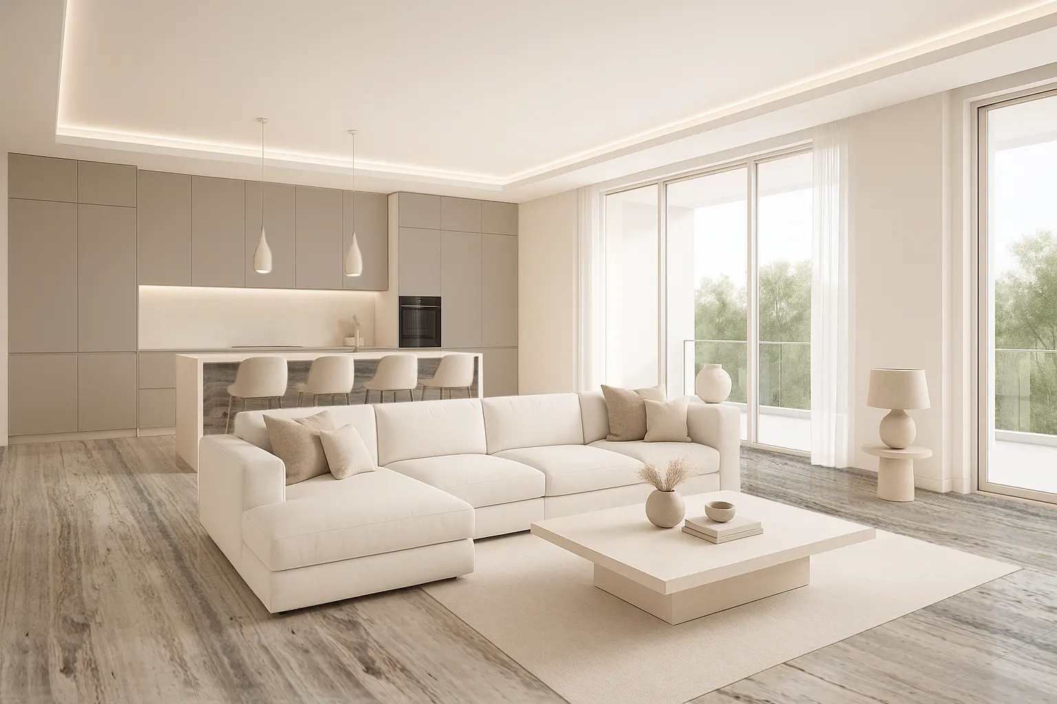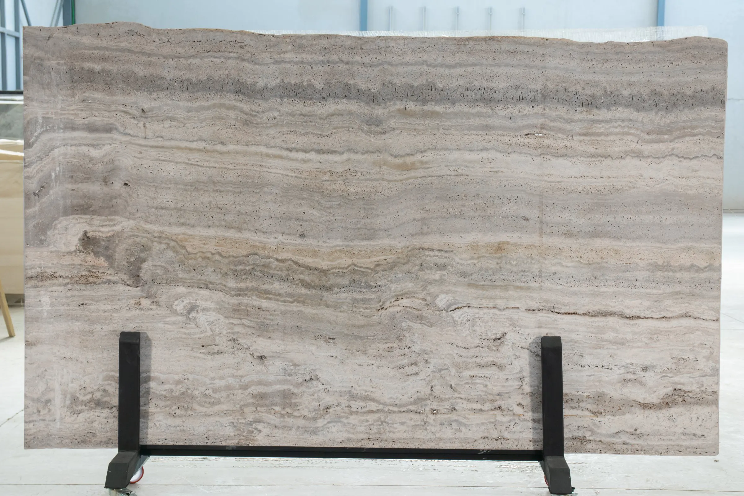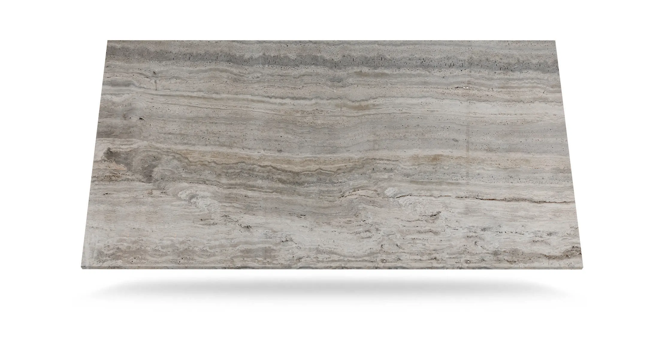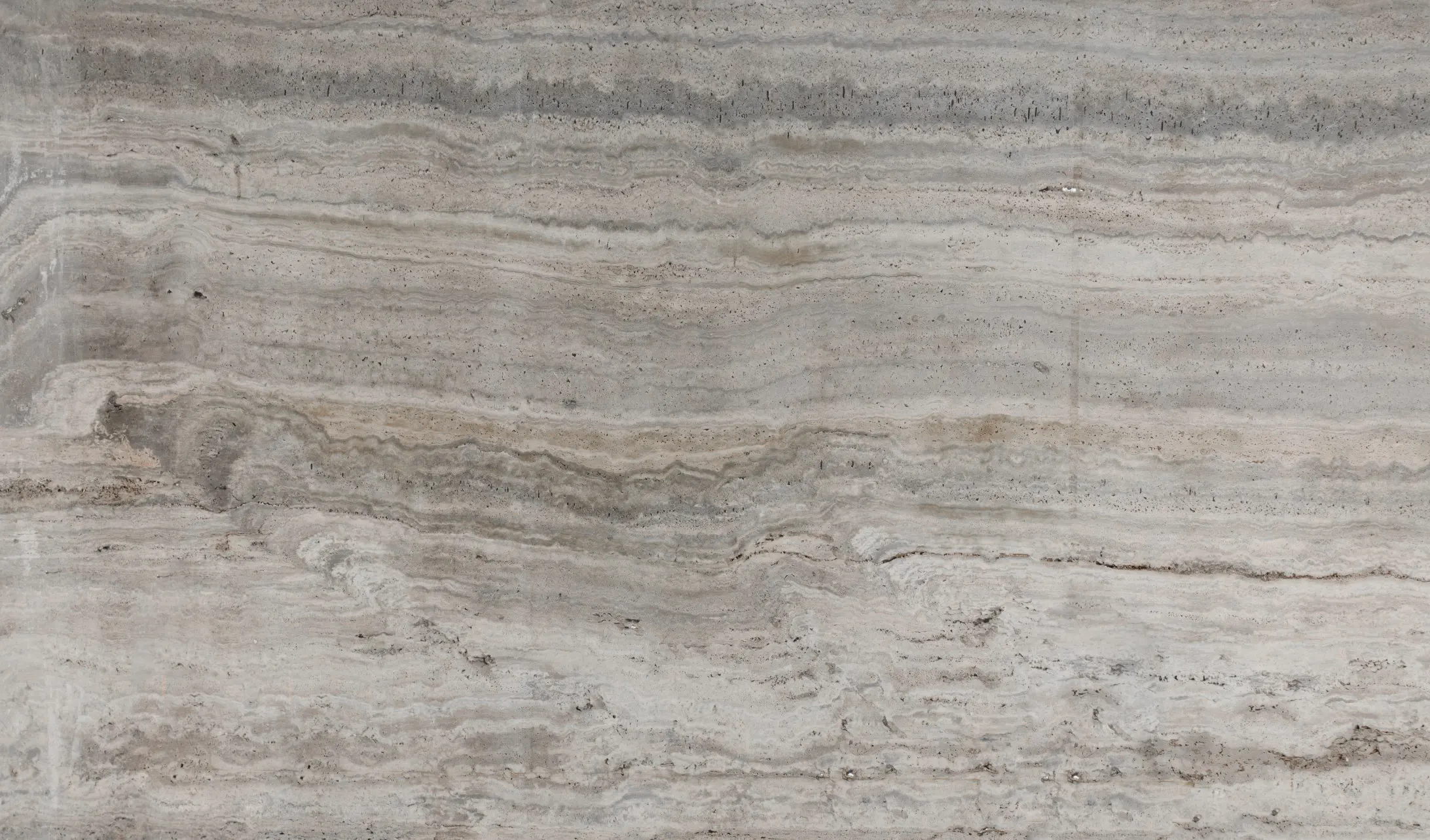 Travertine Silver displays a chromatic range that spans from silver grey to softer earth tones, arranged in horizontal bands that reveal its sedimentary origin. The transition between colors is gradual, creating a calm and well-balanced visual effect. Fine, subtle veins add texture without disturbing the overall harmony.